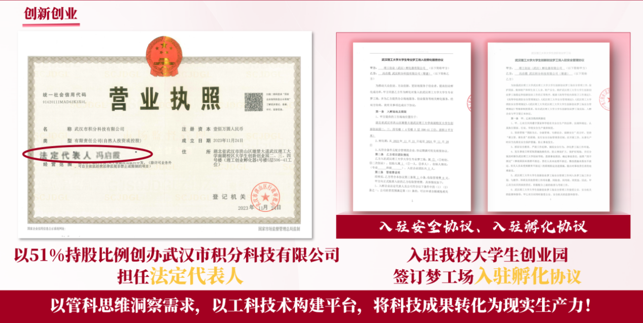 科研之初,缺乏经验的冯启霞好奇又畏惧,但身边朋辈的扶持与师长的鼓励,让她勇敢迈出第一步。面对数据未整合、创造力无发展、资源未汇聚等问题,她以管科思维洞察需求,以工科技术构建平台,文武结合将科技成果转化为现实生产力。她创新性提出高校双创教育数字平台“火箭”模式,目前平台一代已经上线,注册用户达2000人,销售额超6000元。为了巩固创新创业成果,冯启霞以51%持股比例创办武汉市积分科技有限公司,并担任法定代表人,该项目通过答辩考核成功入驻我校大学生创业园。在创新创业的过程中冯启霞还加入了一支船海学院的科创项目团队,作为负责人的她与队员一起伴着凌晨三点的校园讨论方案,一起在余家头创业学院103刷夜通宵,一起每天往返于南湖和余家头两大校区……几月深潜,黄牛耕耘,终于换来了中国国际大学生创新大赛国家银奖的滚烫奖杯。